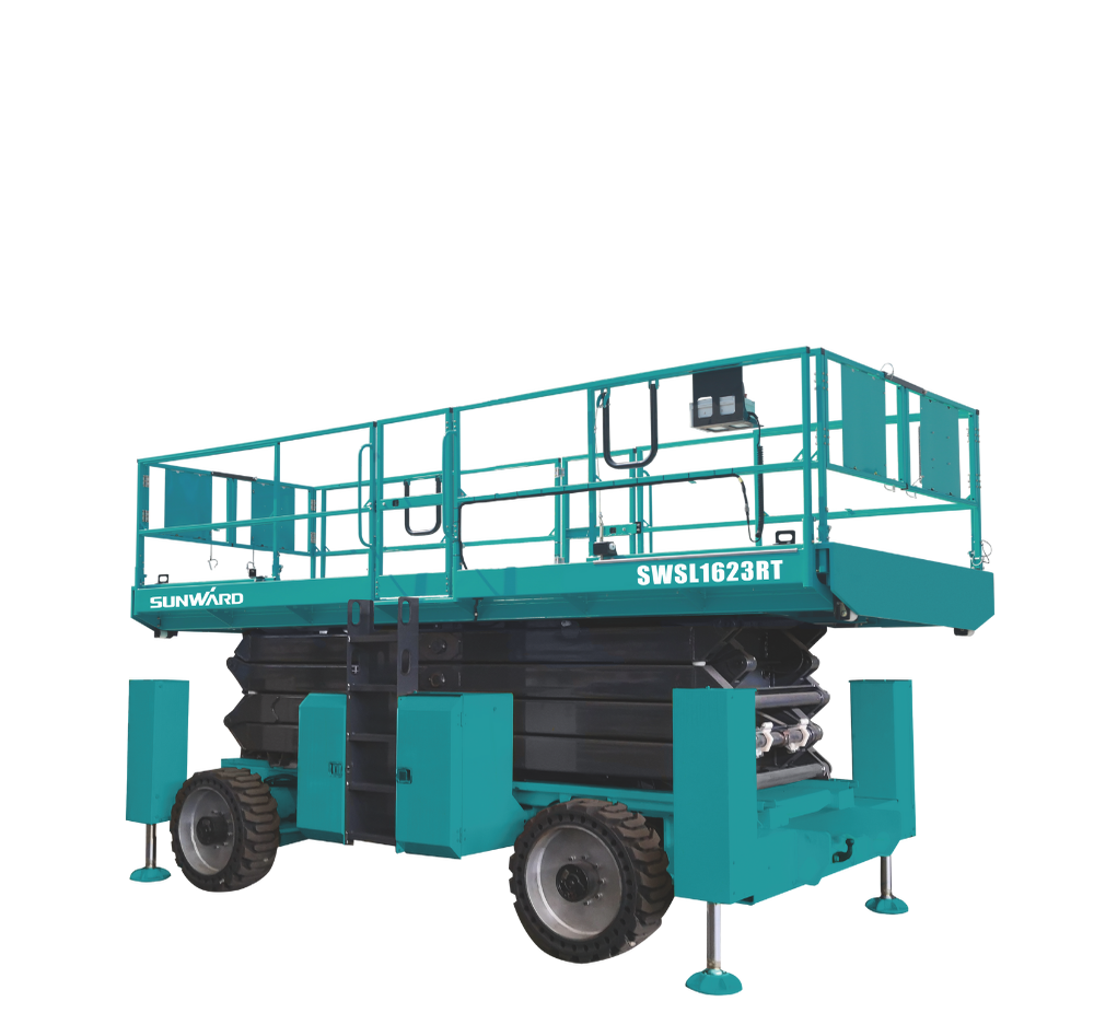 La Sunward SWSL 1623RT est une nacelle ciseaux tout-terrain diesel, conçue pour les terrains accidentés.