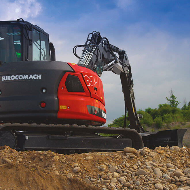 La 100TR est équipé avec bras à volée variable, qui offre une extension plus longue et un rappel plus important: cela facilite les opérations d’excavation en proximité de la machine et facilite les opérations de chargement.
