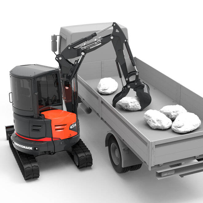 Le nouveau 45TR est le premier et le seul modèle équipé de volée variable de son segment, un véritable allié des opérateurs sur tous types de chantiers. Étant à rayon court, la machine conserve un profil extrêmement compact, avec une saillie de seulement 100 mm. La combinaison du moteur Turbo (33 kW) et du système hydraulique Load Sensing avec pompe à gestion électronique et des commandes électro-proportionnelles font de ce modèle une machine de catégorie supérieure.