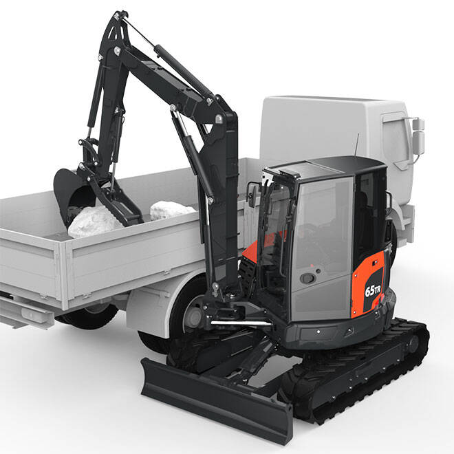 Le bras à volée variable facilite les opérations d'excavation près de la machine et facilite les opérations de chargement, en donnant à la machine une polyvalence unique dans la catégorie des 60 quintaux.